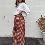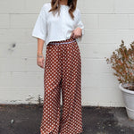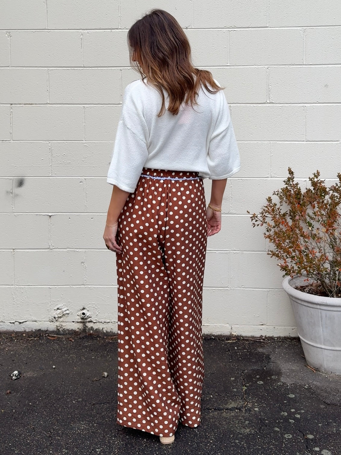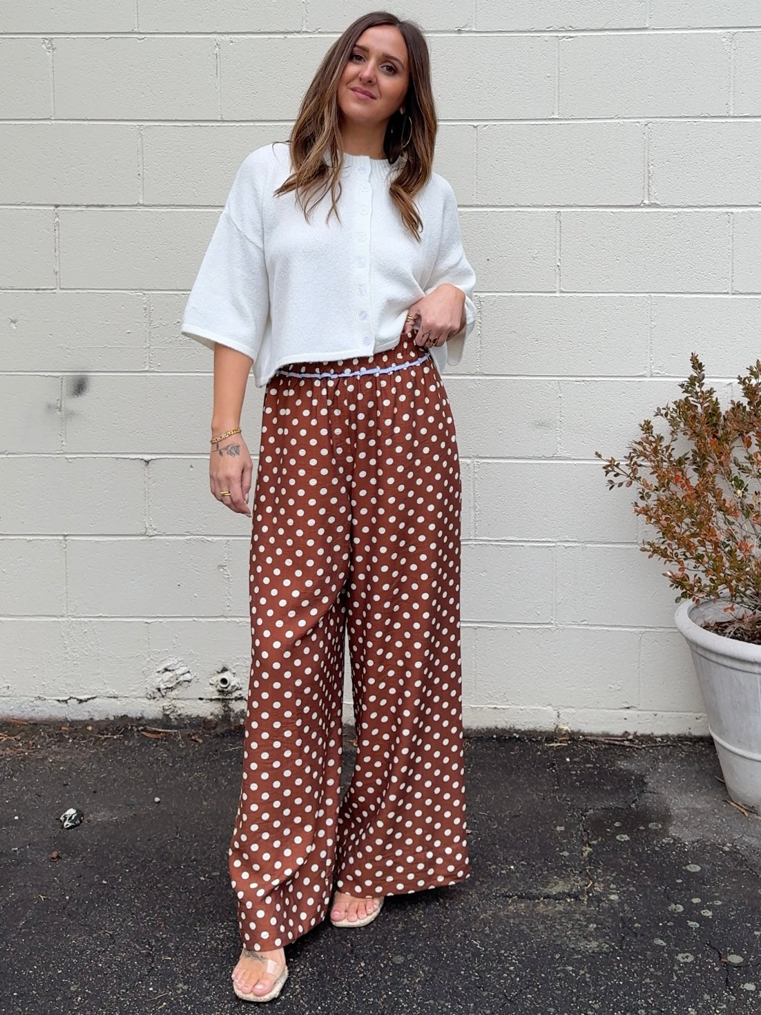 Step into comfort and style with the Alicia Pants, featuring a relaxed wide-leg silhouette that moves with you all day. The playful brown base is dotted with cheerful white polka dots, while a pop of light blue contrast piping at the waistline adds a fun finishing touch. The elastic waist ensures a comfortable, forgiving fit that's perfect for everything from casual hangouts to weekend adventures. Effortlessly chic and undeniably comfy.