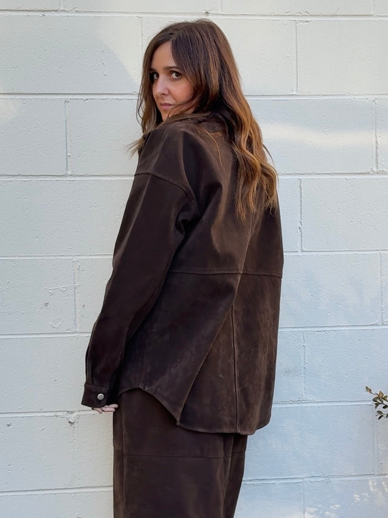 The Aliza Jacket is your new go-to for effortless cool. Crafted from smooth faux suede, this classic snap button style layers beautifully over everything from tees to sweaters. The chocolate silhouette pairs perfectly with the Ellianna Midi Skirt for a complete matching set. Whether you're heading out for coffee or a night on the town, this timeless piece brings that perfect blend of polish and ease to your wardrobe.