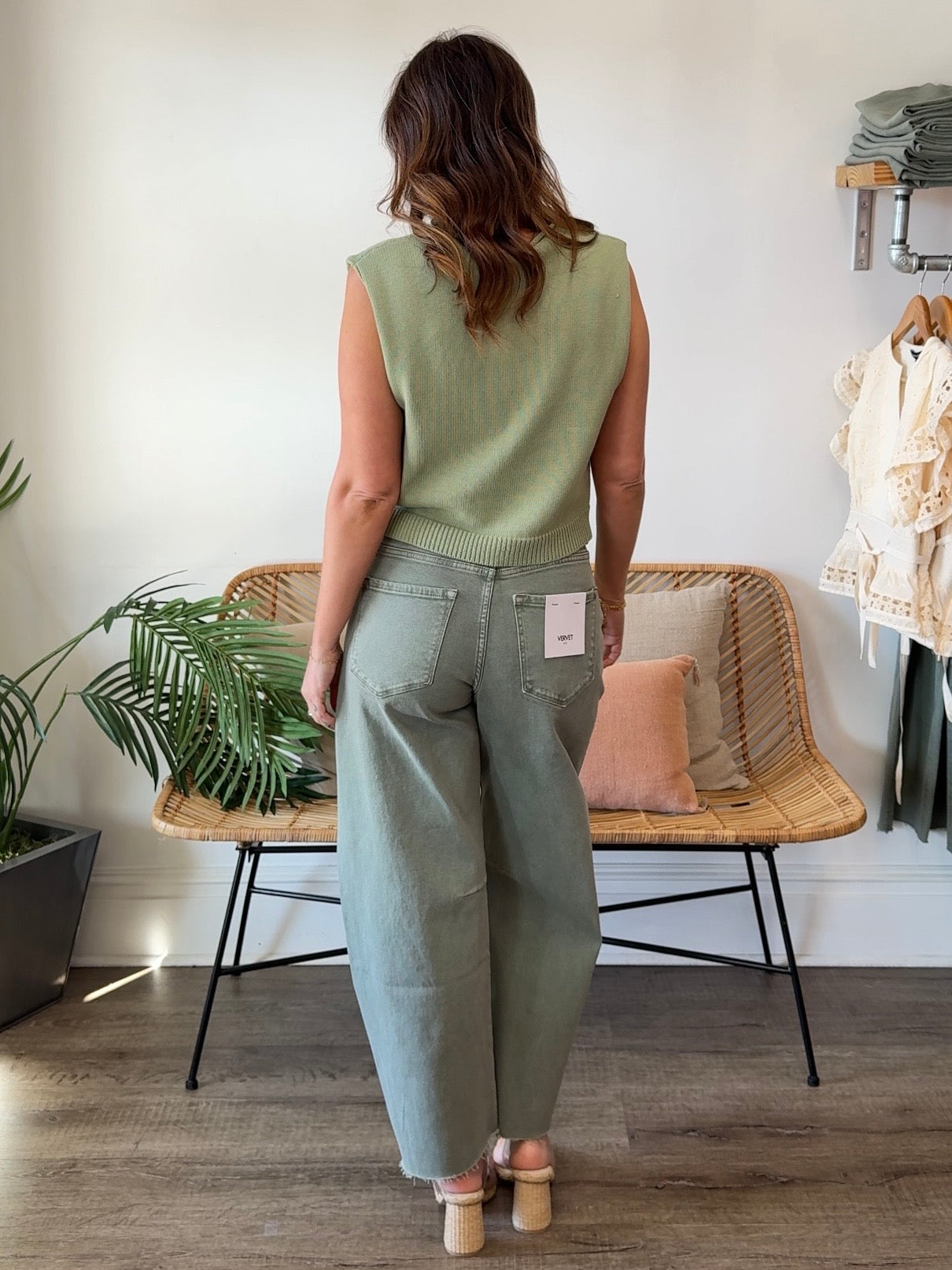 Introducing the Aubrey Jeans—your new go-to for effortless cool. These olive green barrel-leg beauties feature an edgy unfinished hem that screams modern style, paired with a grommet detail and waist tie belt for that perfect adjustable fit. Zip and button fly closure keeps things secure, while front and back pockets deliver practical storage. Whether you're dressing up or keeping it casual, the Aubrey's got the vibe you're looking for.