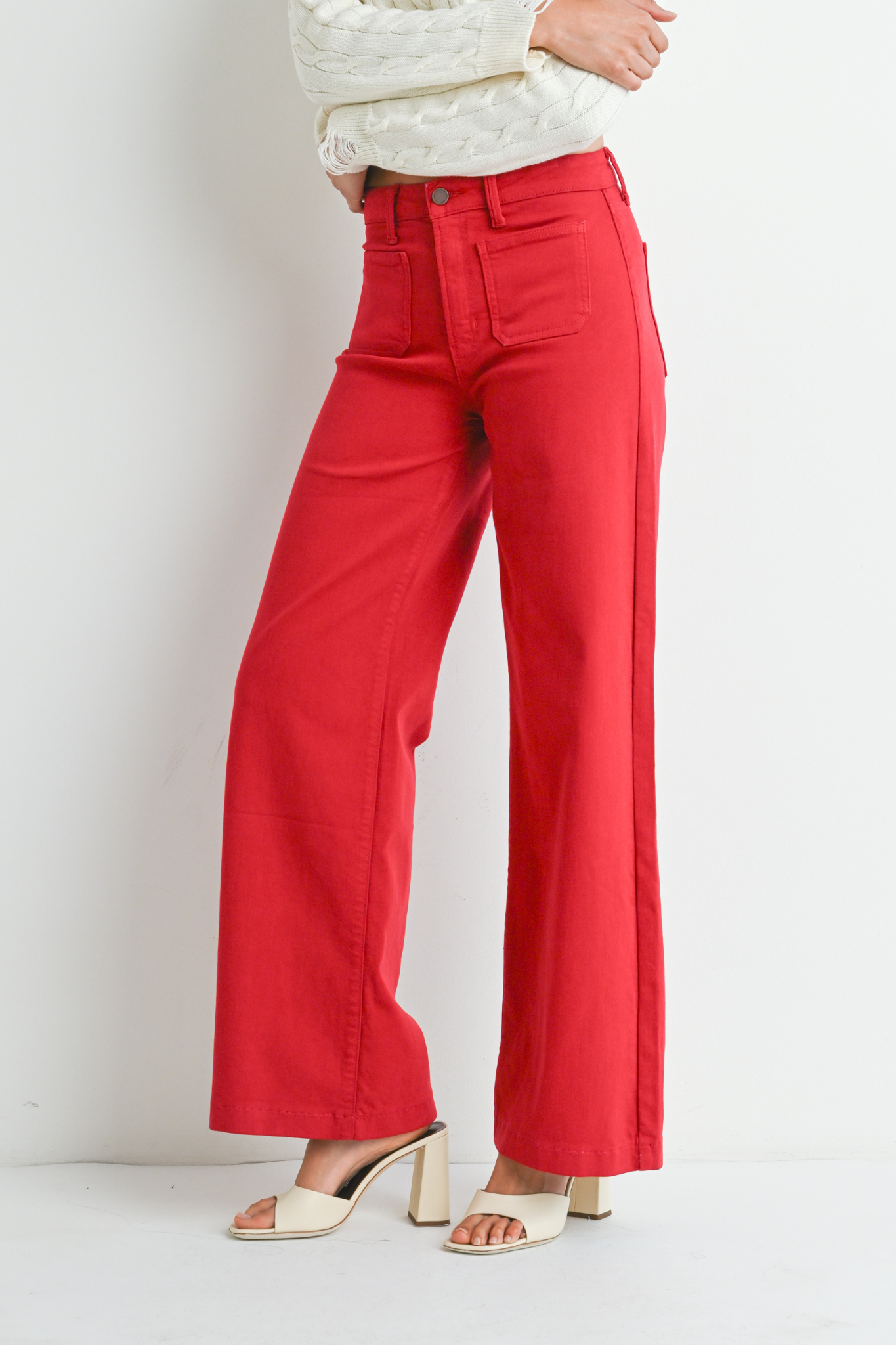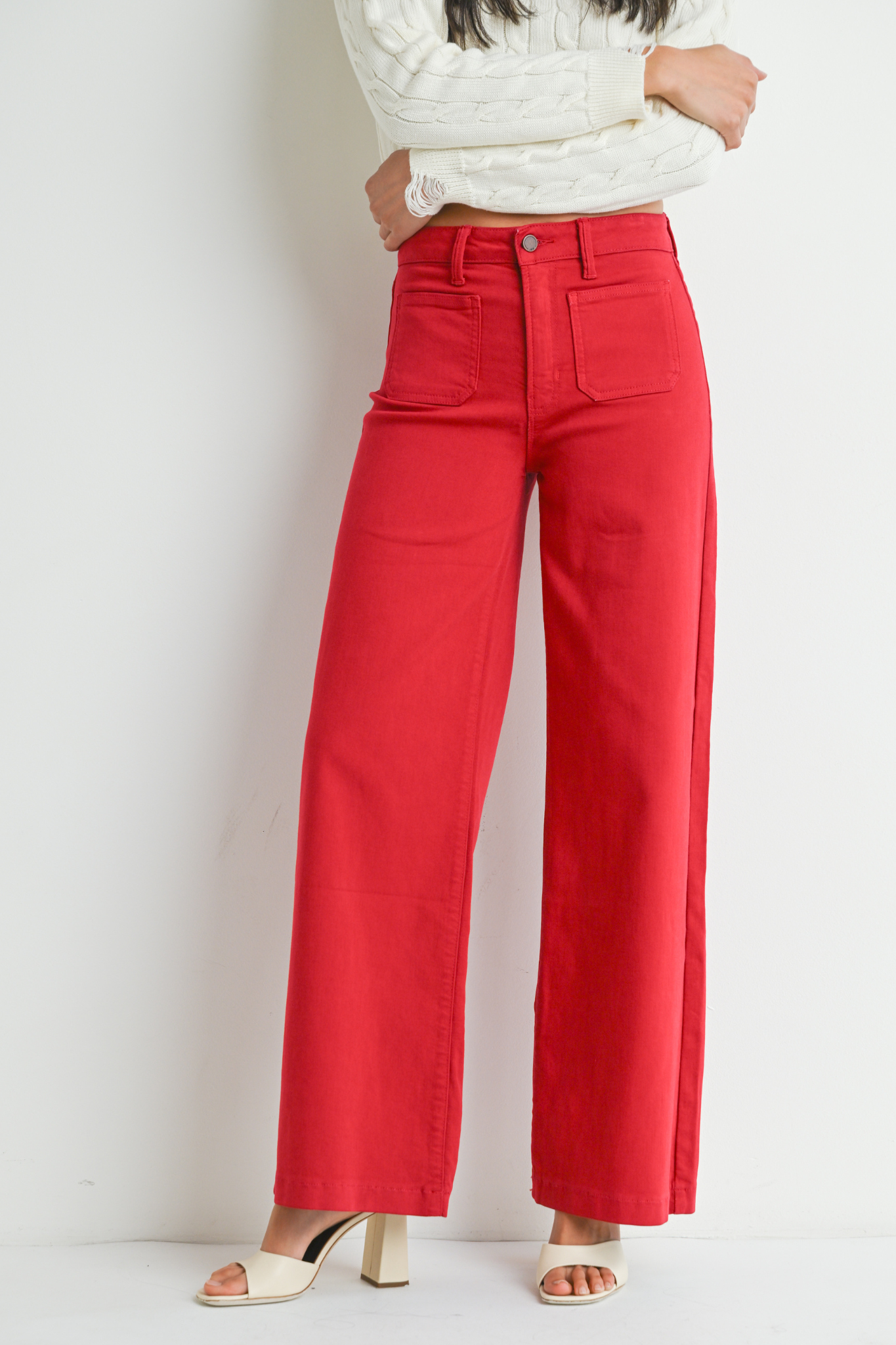 Elevate your wardrobe with the Belle Patch Pocket Jeans, featuring a high-rise fit and wide-leg silhouette for a bold, flattering look. Crafted in a rich dark red hue, these jeans come with functional patch pockets on the front, adding both style and practicality. Perfect for making a statement while ensuring comfort throughout your day.