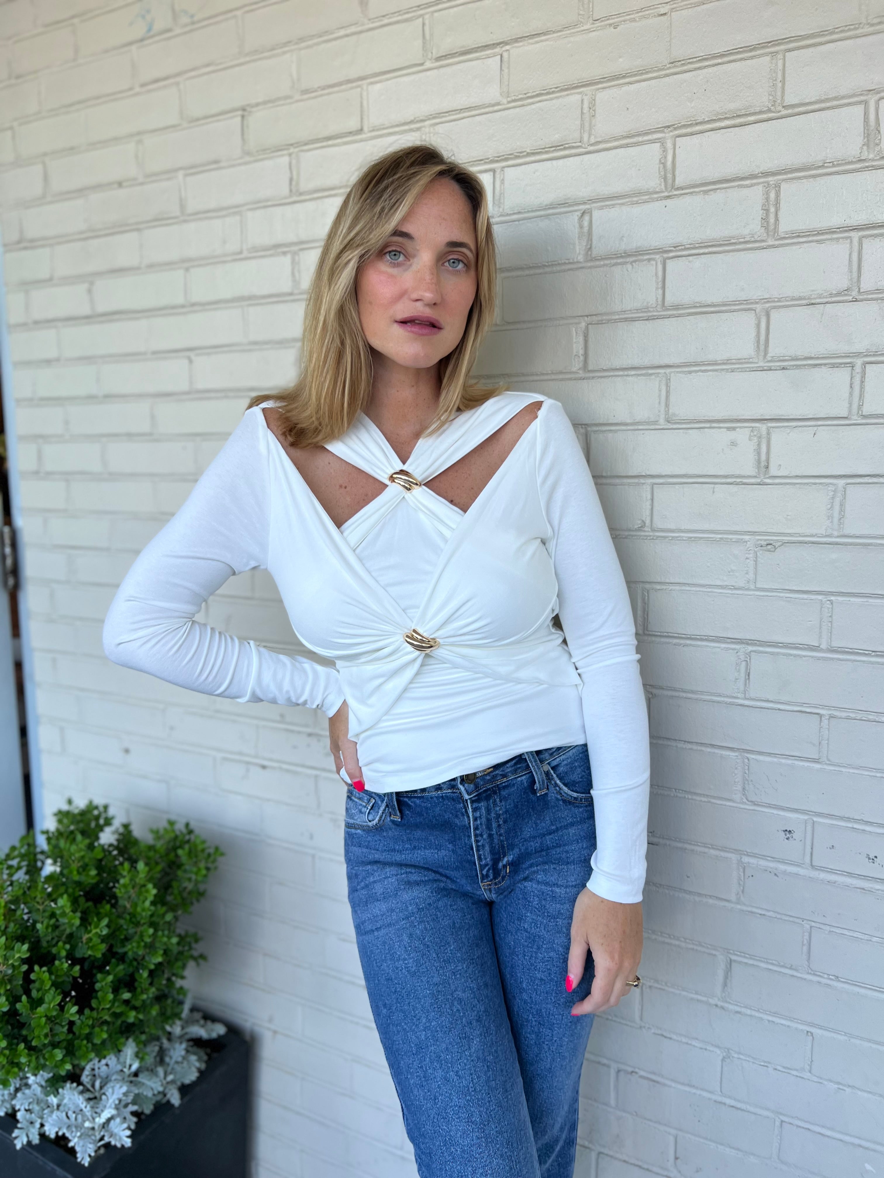 The Blaire Top is a must-have in your closet with colors black and white color option. Two gold metal accents easily pull the fabric together for a seamless and chic look. You'll look and feel effortlessly stylish!