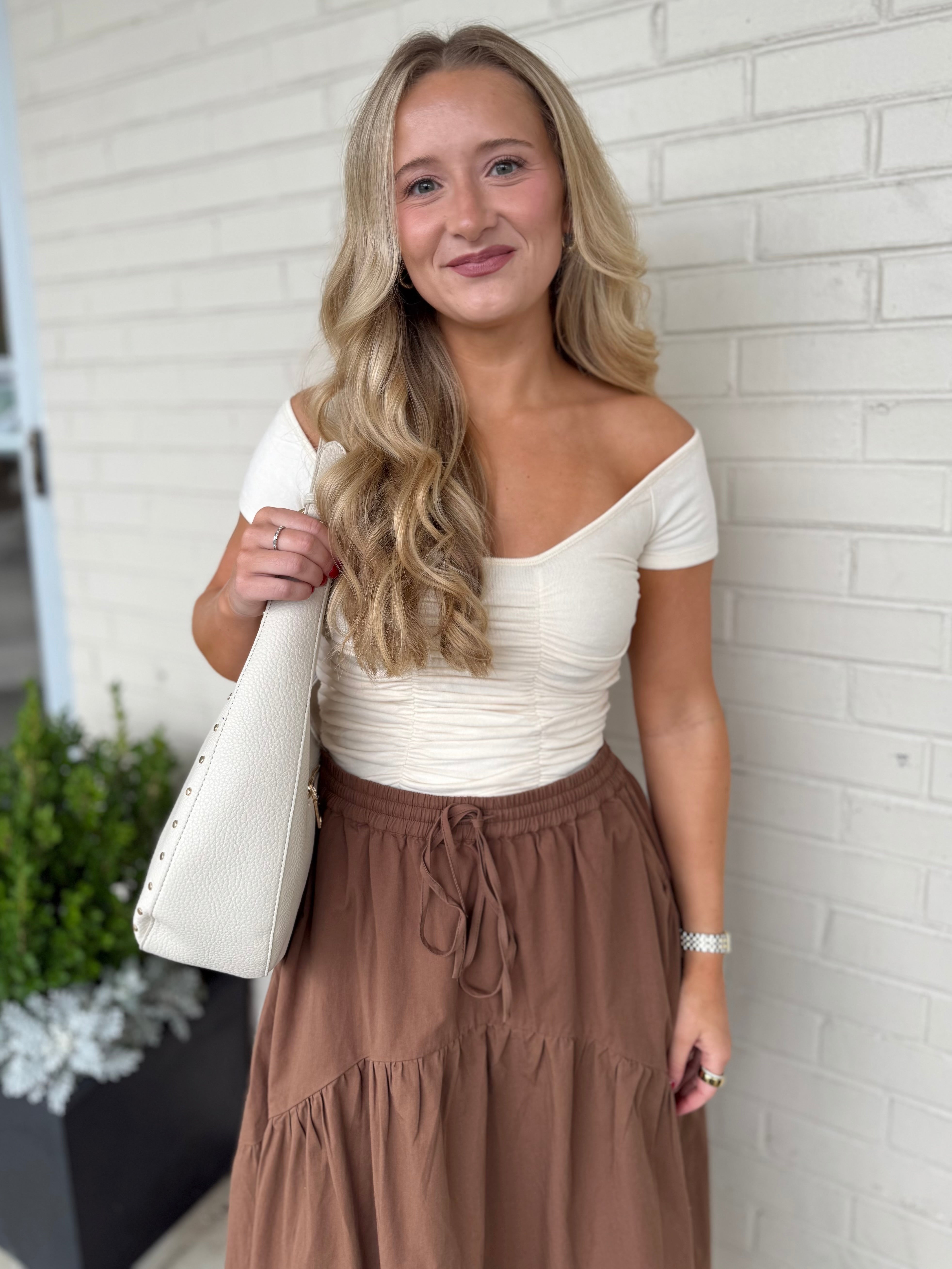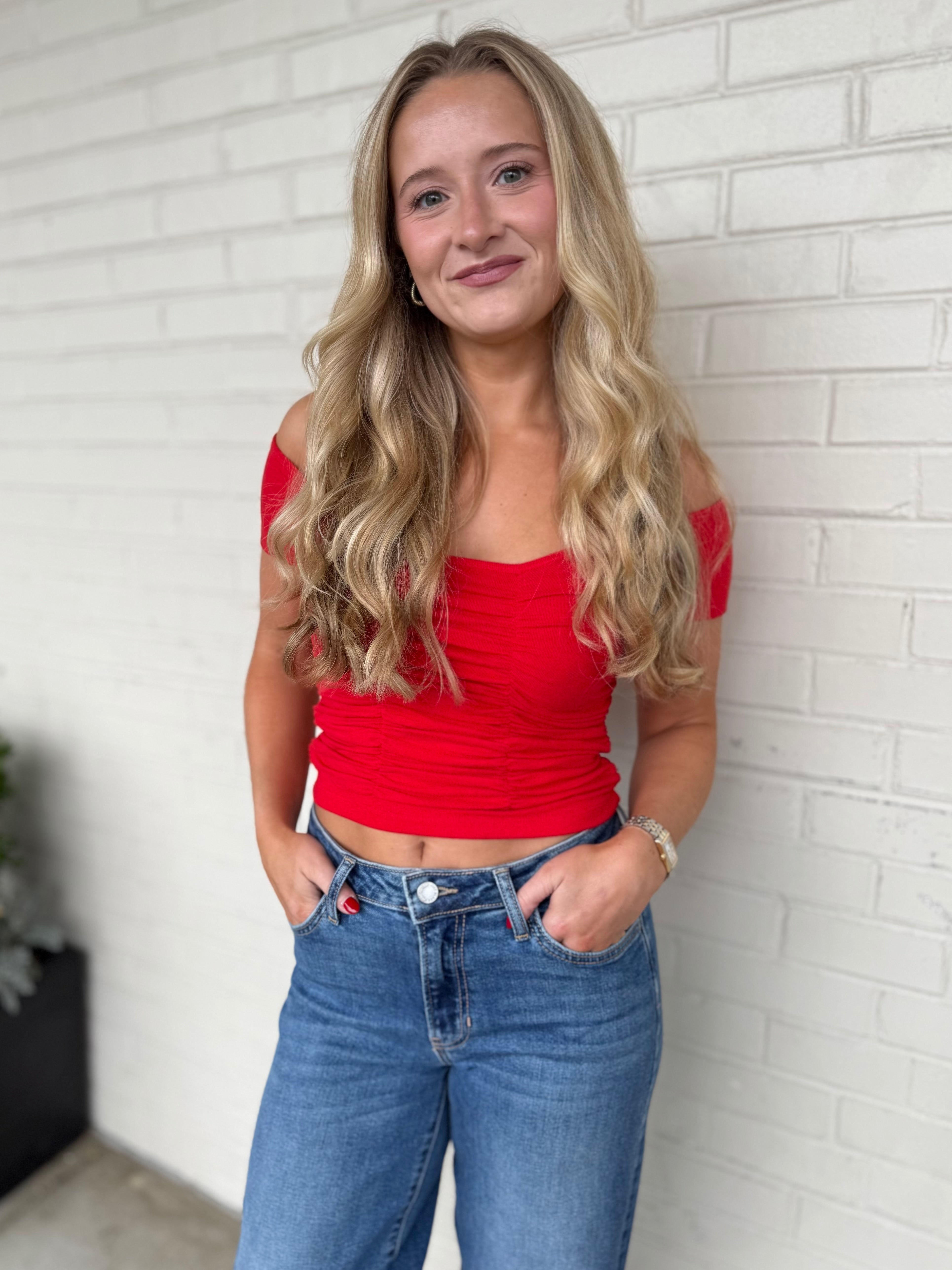 The Frensis Top is a stylish fitted, ruched cropped piece that highlights your silhouette with its delicate off-shoulder neckline. Designed with short sleeves for comfort and flair, it adds a chic touch to any outfit. Available in three vibrant colors, this top effortlessly elevates your wardrobe and suits a variety of occasions.