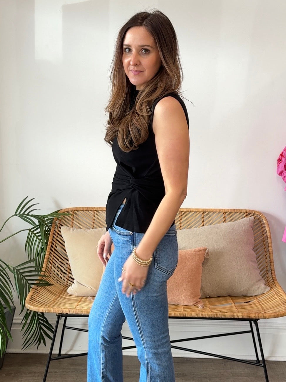 The Josephine Top is a sleek black knit tank that combines minimalist style with modern detail. The front features a subtle side twist that creates dimension and visual interest, while a strategic slit adds an edgy touch. Crafted from soft knit fabric, it's versatile enough for layering or wearing solo. Perfect for casual outings or dressed up for evening wear.