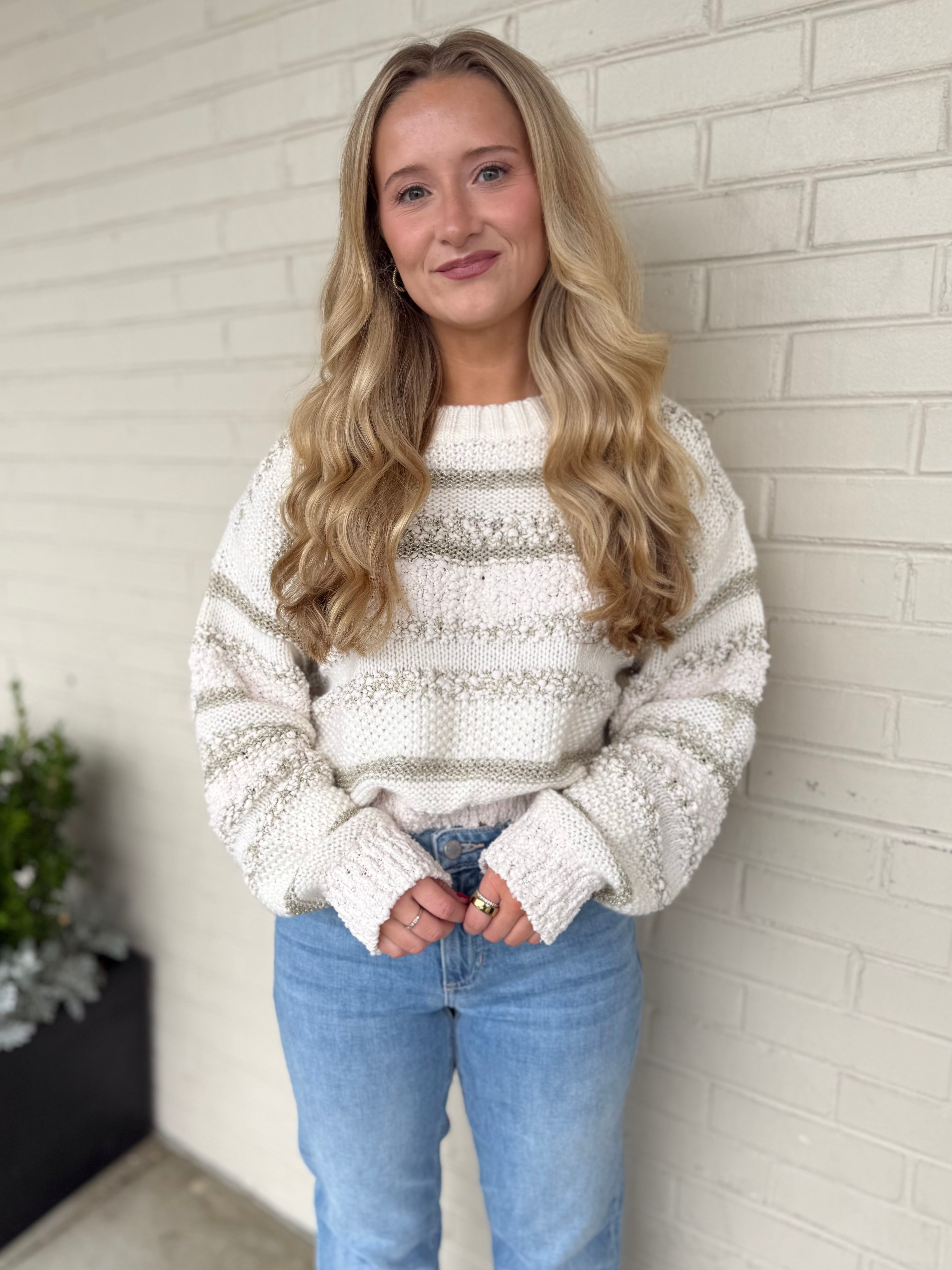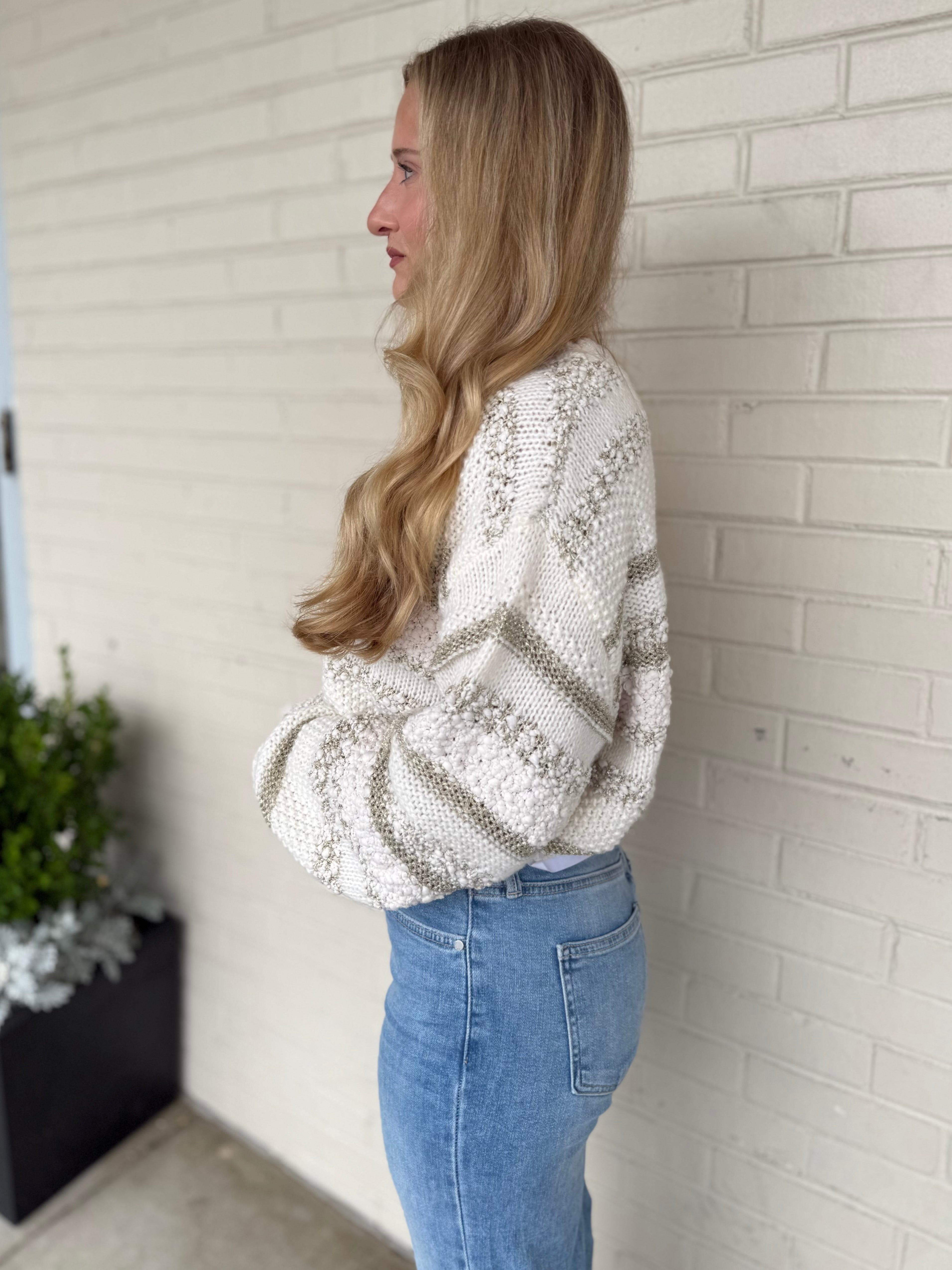 The Leighton Sweater combines cozy comfort with stylish detail. Its relaxed drop shoulder design offers a flattering fit, while the classic crewneck ensures timeless appeal. Striking stripes paired with subtle gold accents add a touch of elegance, making this sweater perfect for elevating everyday looks with effortless charm.