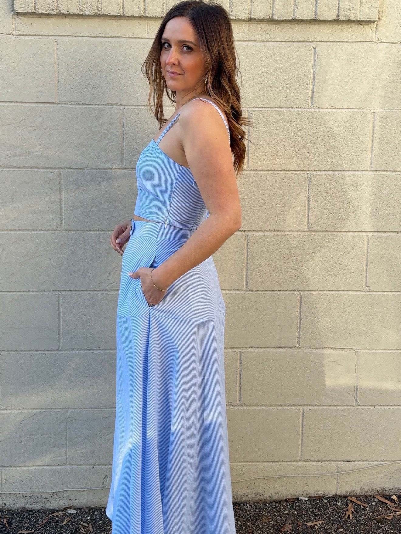 This charming midi skirt pairs bold stripes with a graceful A-line cut that flatters every figure. Adorned with decorative buttons that bring personality to the piece, it's the kind of go-to style that works whether you're dressing up or keeping things casual. Simple, striking, and endlessly wearable.