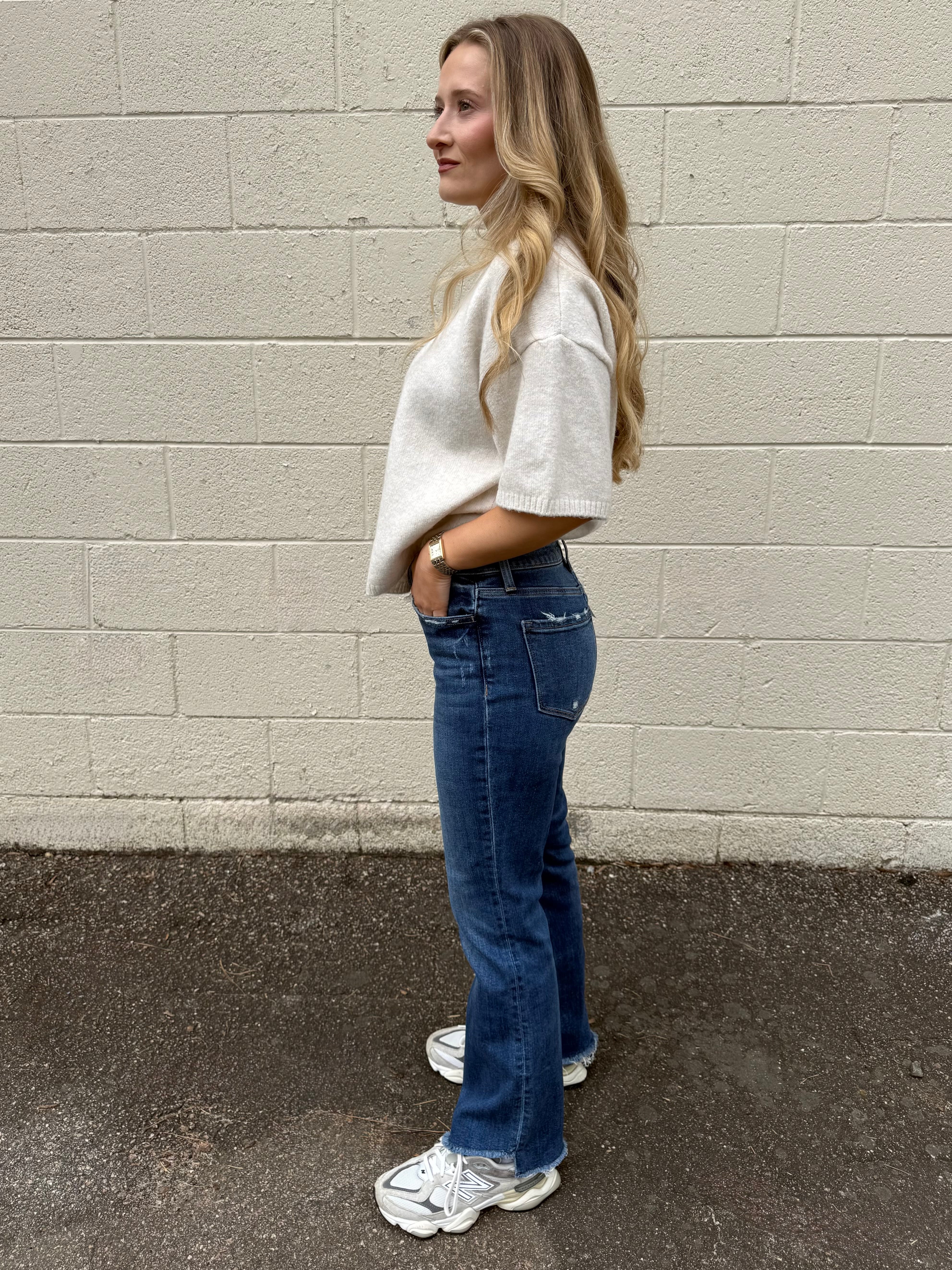 These dark wash crop flares are giving effortless cool-girl energy. The distressed bottom hem adds just the right amount of edge, while the cropped length keeps things modern and flattering. Pair them with your favorite crop top or oversized tee for a look that's equal parts chic and fun. A wardrobe essential that works as hard as you do.
