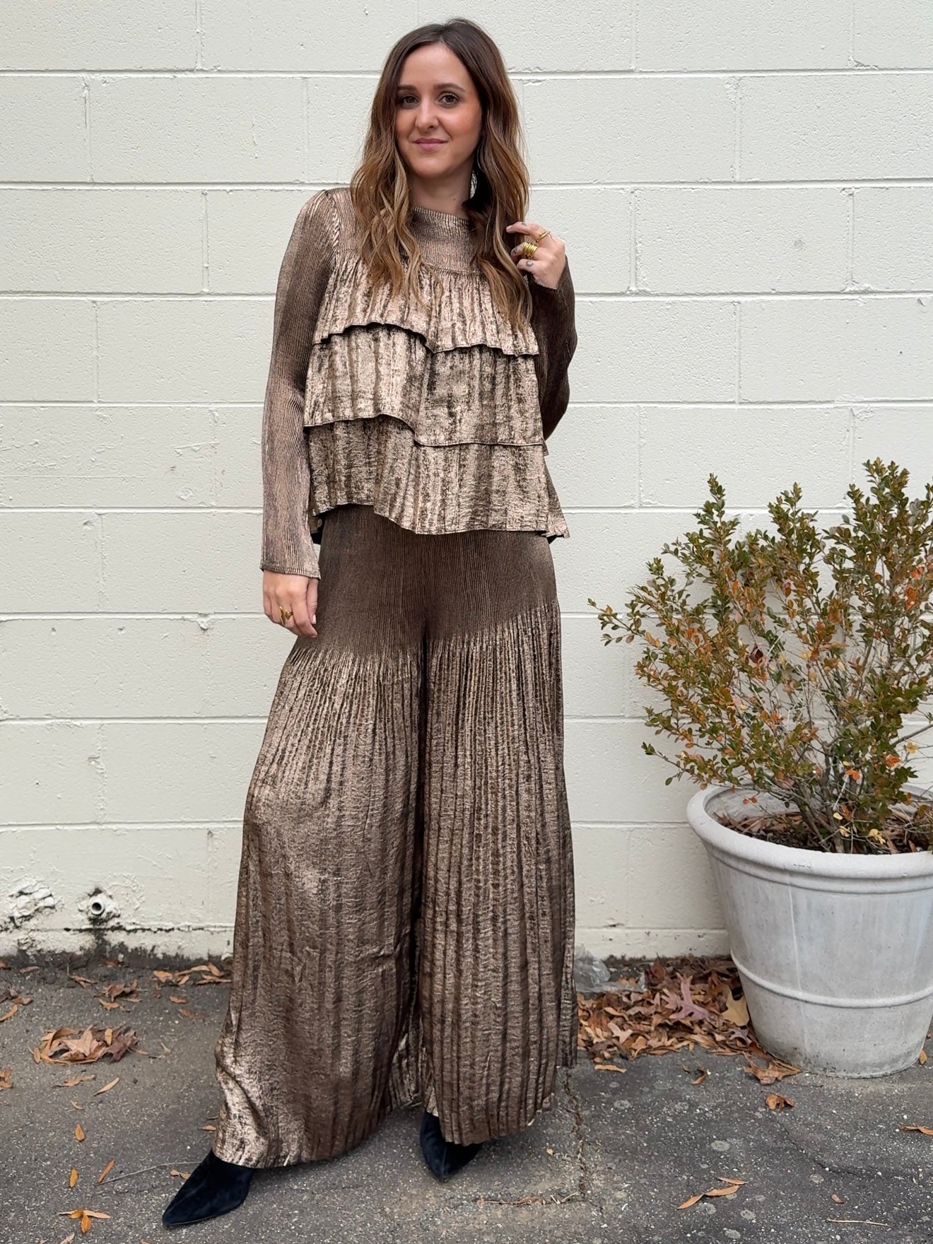 Step into statement-making style with the Miley Pants—a show-stopping pair featuring a comfortable elastic waist and dramatic wide legs with crisp pleats. The shimmering metallic finish catches the light with every move, making these pants perfect for nights out or when you want to turn heads. Pair them solo for maximum impact or match with our optional coordinating top for a fully coordinated look. Effortless glamour meets everyday comfort.