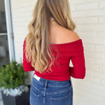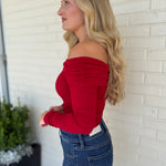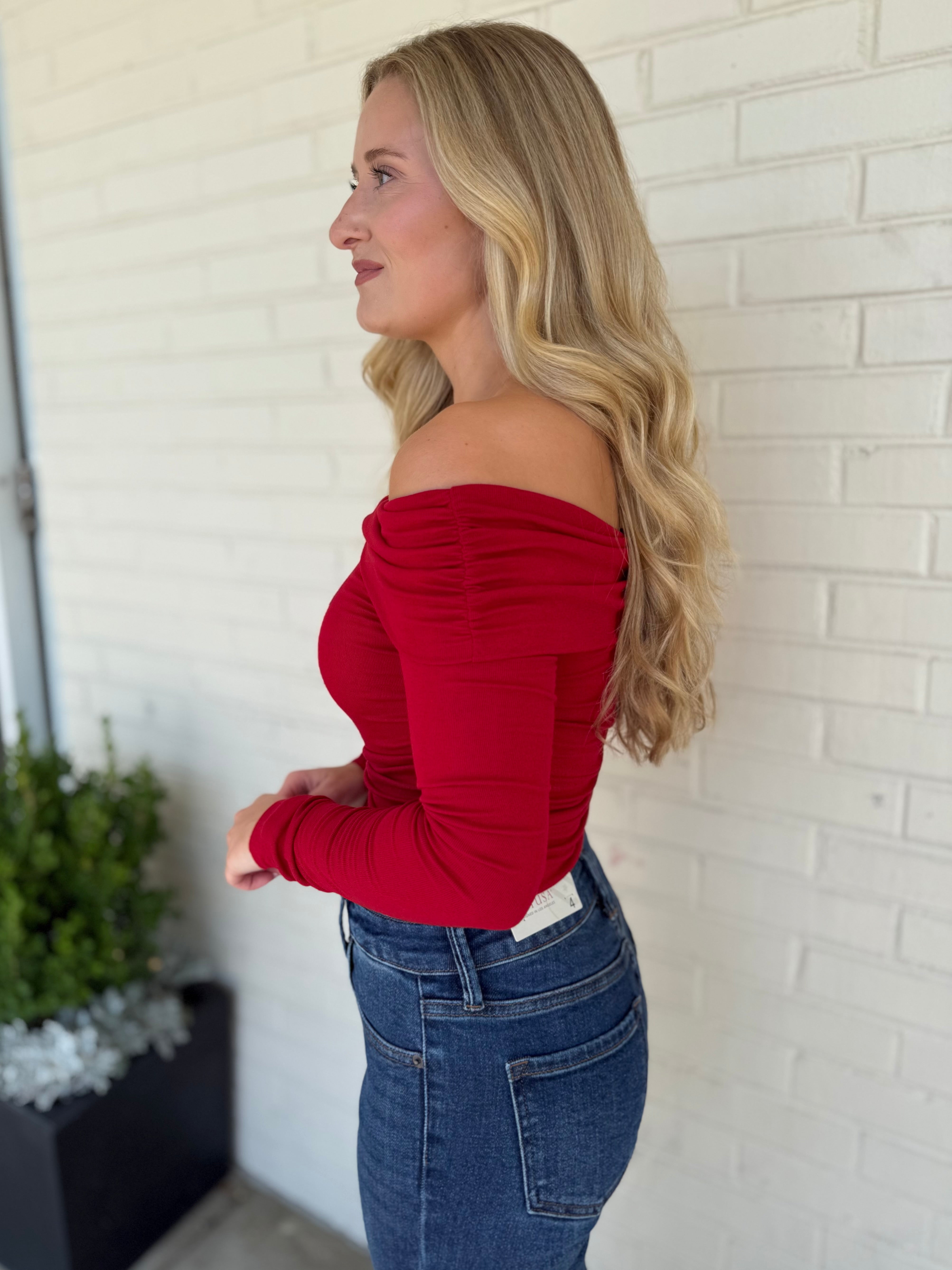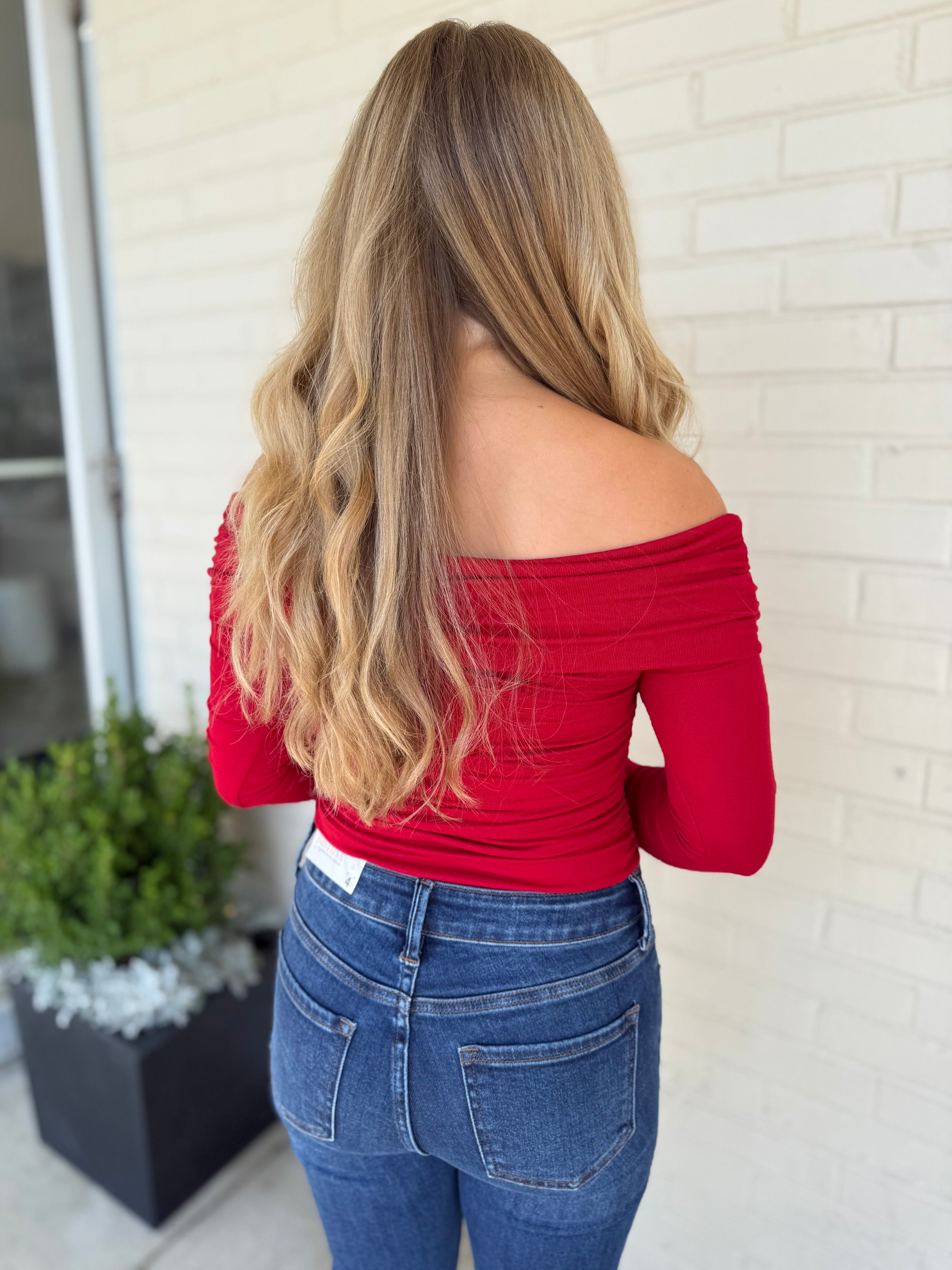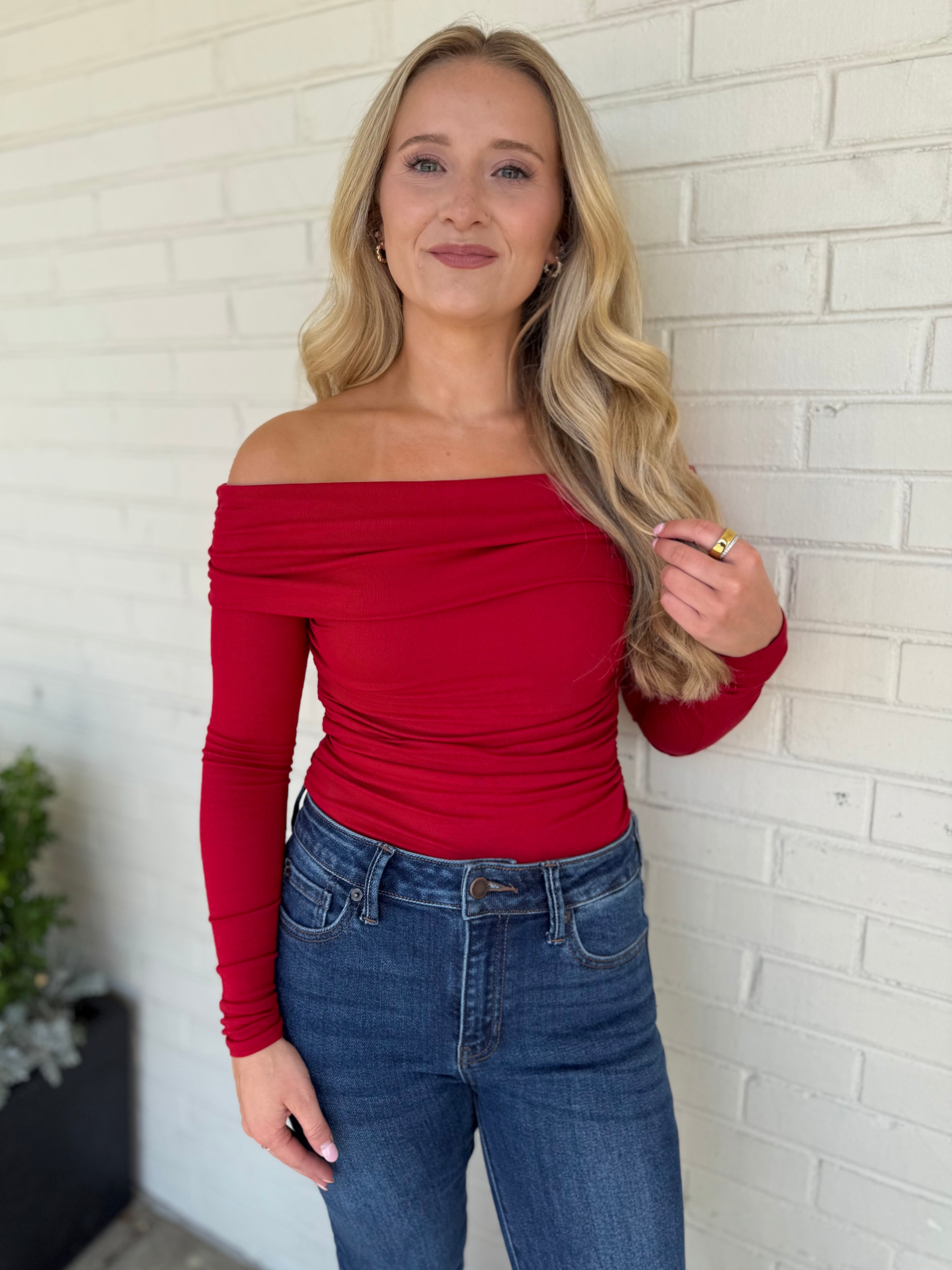 The Mimi Bodysuit is available in both a rich brown and scarlet hue with an off-the-shoulder neckline and long sleeves for a chic, modern look. Ruched detailing along the sides adds flattering texture, while the convenient snap button closure ensures a secure fit. This bodysuit combines style and ease, making it a versatile foundation for both casual and dressed-up ensembles.