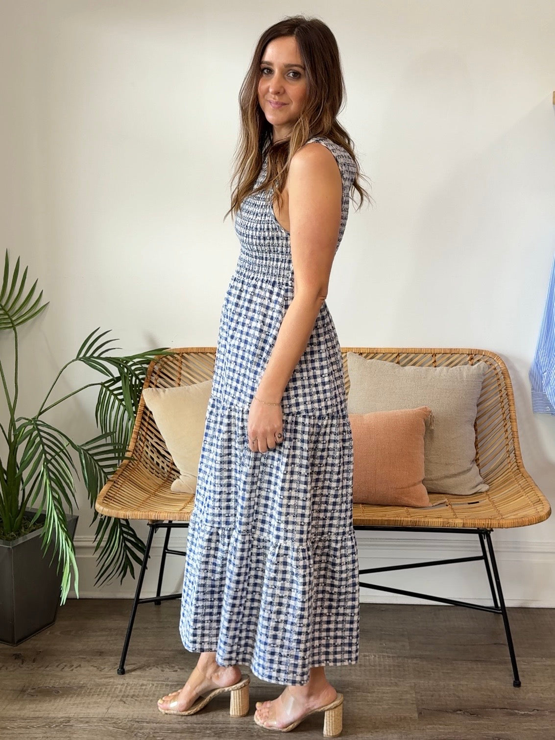 The Murphy Dress is your new go-to for effortless charm. This sleeveless gingham beauty features a smocked top that hugs just right, paired with a flowy tiered skirt that twirls with every step. Perfect for summer gatherings, casual dates, or whenever you want to feel put-together without trying too hard. The classic gingham pattern brings that sweet, nostalgic vibe while the midi length keeps things polished and versatile. Dress it up with sandals or down with sneakers—this one does it all.