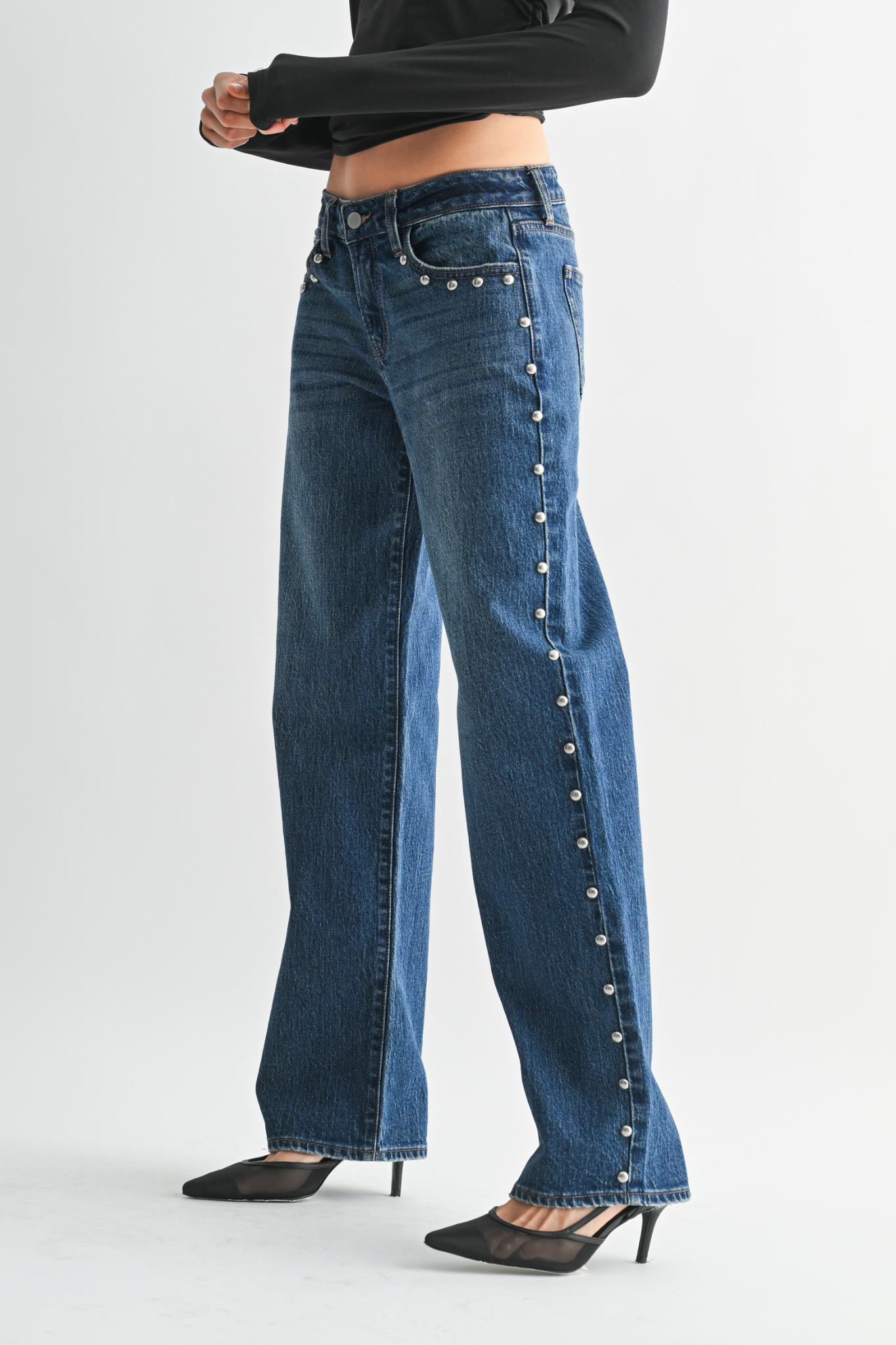 Elevate your casual style with the Sabrina Studded Jeans. These medium wash, low-rise jeans feature edgy studded details and a relaxed baggy fit for all-day comfort. Perfect for making a bold statement while keeping effortless cool, they pair well with your favorite tees and sneakers. Embrace standout style and unmatched comfort in one must-have denim.