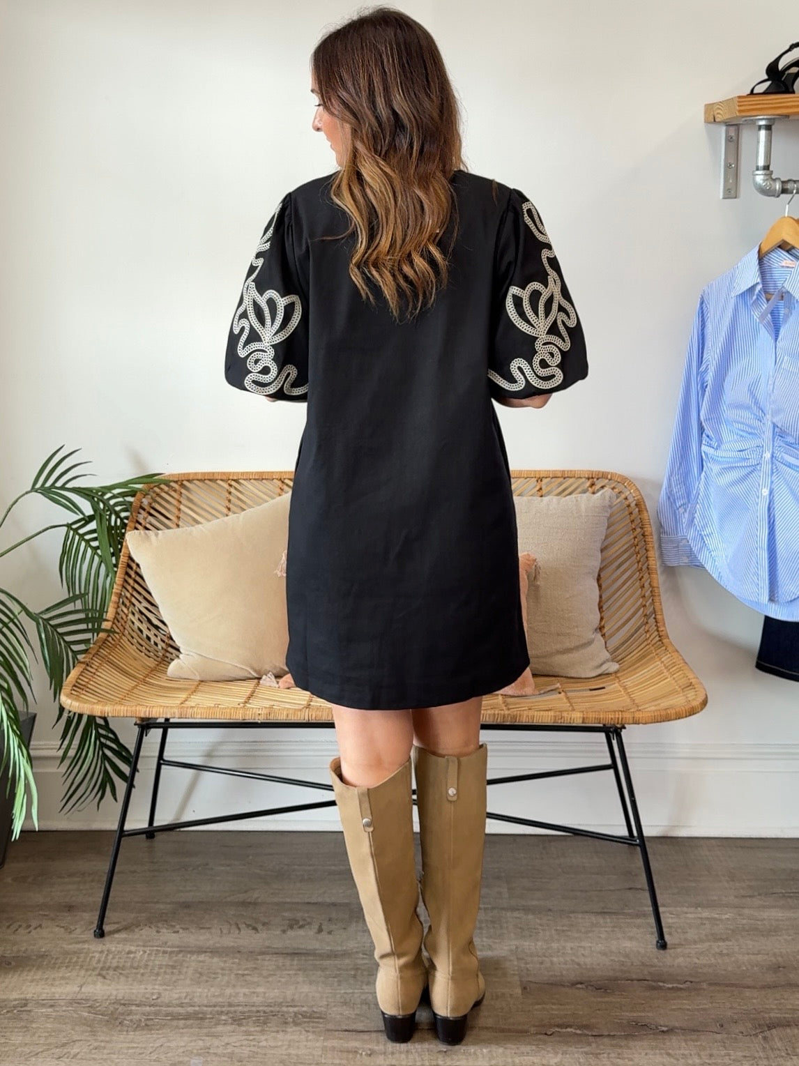 Introducing the Saige Dress—your new go-to for effortless style with a playful twist! This charming black mini dress features delicate cream floral stitching that adds a touch of whimsy, paired with romantic puffed sleeves for that perfect blend of sweet and chic. The flattering V-neck creates a polished silhouette, while hidden pockets keep your essentials close. Whether you're heading out for brunch or a night on the town, the Saige Dress delivers personality and practicality in one adorable package.