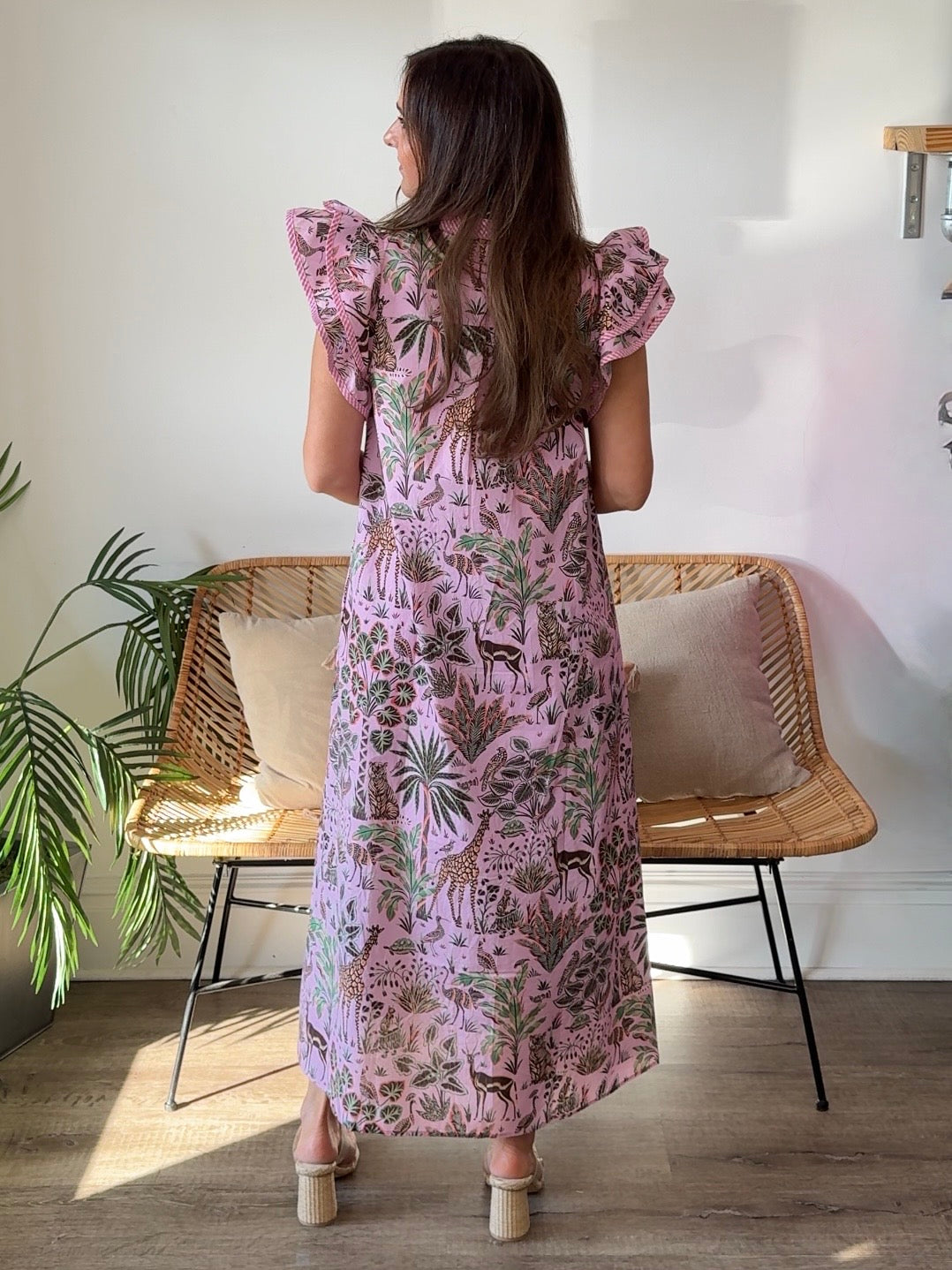 The Sam Dress brings effortless charm with its botanical animal print and playful ruffle cap sleeves. A contrast stripe placket and ruffle band collar add personality, while the front button closure keeps things practical. Side pockets offer convenient storage, and the lined, non-sheer woven fabric ensures comfort and coverage. Perfect for warm-weather outings, this lightweight midi dress transitions seamlessly from day to evening.