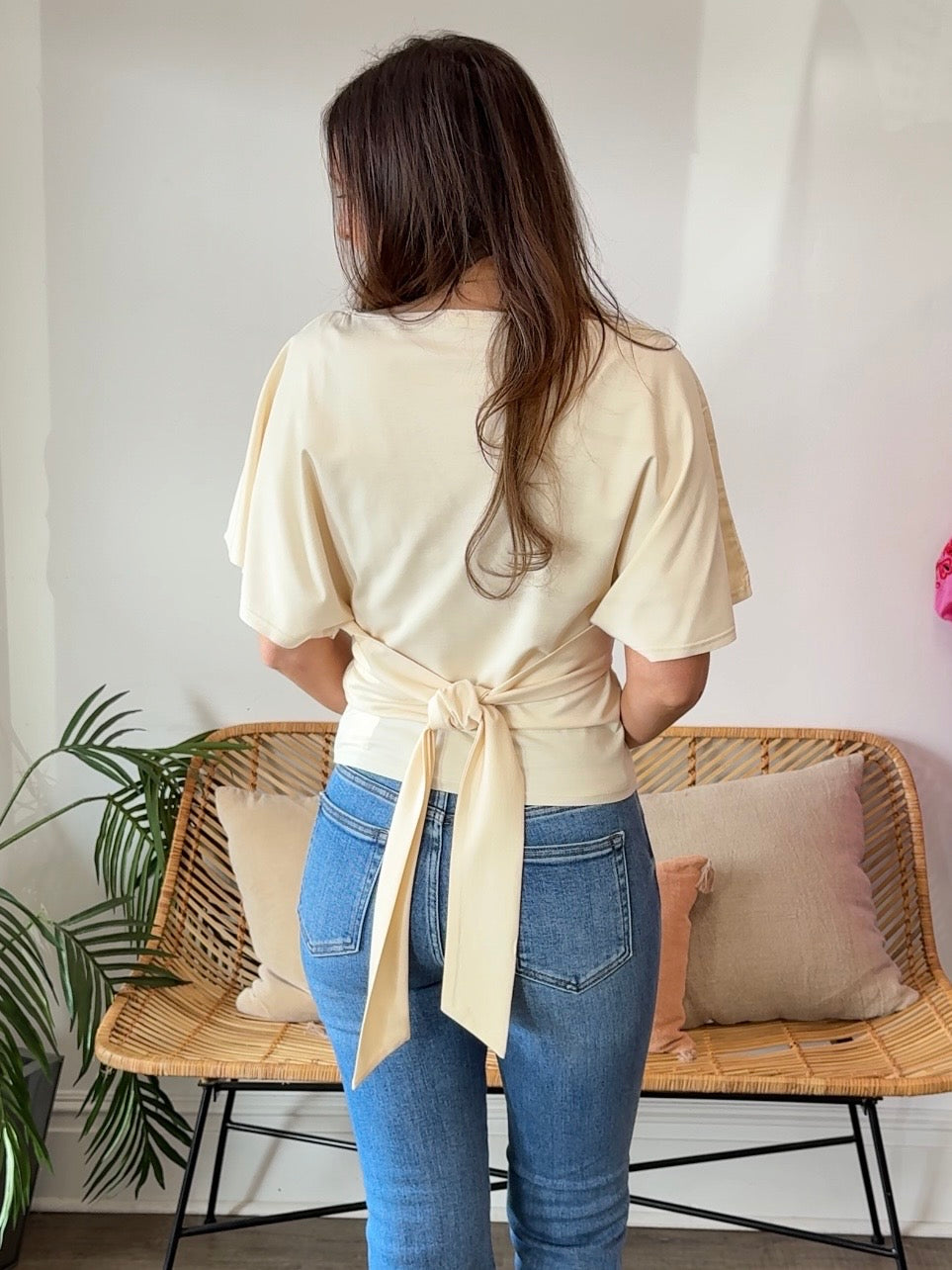 The Shianne Top is a breezy short sleeve t-shirt designed with a flattering tie detail at the back (or front, depending on your style preference). Perfect for warm weather, this versatile piece transitions effortlessly from casual days to dressed-up occasions. The flutter sleeves add a touch of feminine movement, while the adjustable tie allows you to customize the fit and create your own unique look. Lightweight and comfortable, it's a wardrobe essential that works with everything from jeans to skirts.
