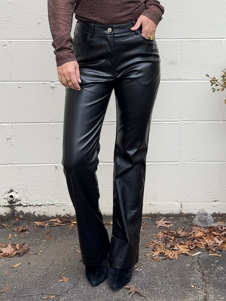 Rock a bold silhouette with these edgy vegan leather wide-leg pants. Crafted from durable faux leather with a flattering high-waisted cut, they're the ultimate winter essential that transitions effortlessly from casual to dressed-up. The sleek black finish pairs with everything, making these pants the hardworking hero piece your wardrobe has been waiting for.